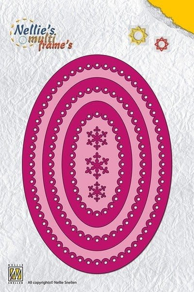 Wykrojnik do wycinania i wytłaczania w kształcie ozdobnych ramek. Siedem owalnych ozdobników. Można wycinać ramki z pełnym tłem oraz same obramowania.