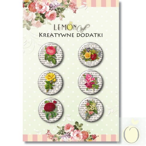 Zestaw 6 samoprzylepnych buttonów z różnymi motywami.